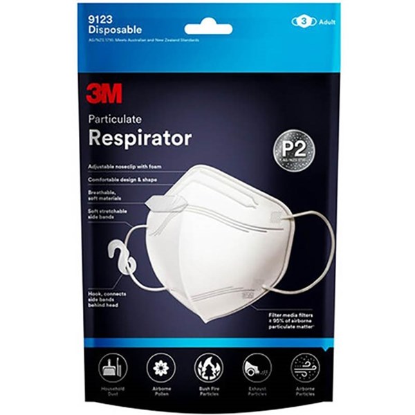 The 3M Particulate Respirator 9123 is a maintenance-free, flat fold P2 disposable respirator that is intended for use by consumers used in consumer applications (and other users where permitted by applicable regulations) to help reduce exposure to certain airborne particulate matter - The respirator is worn over the mouth and nose and attaches via elastic side bands with hook attachment behind the base of the head/top of the neck