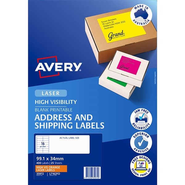 AVERY 35972 L7162FO HIGH VISIBILITY SHIPPING LABEL LASER 16UP FLUORO ORANGE PACK 25