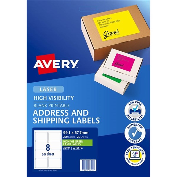 AVERY 36104 L7165FG HIGH VISIBILITY SHIPPING LABEL LASER 8UP FLUORO GREEN BOX 25