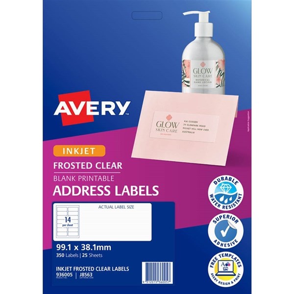 AVERY 936005 J8563 INKJET LABEL 14UP CLEAR WITH MATT FINISH PACK 25