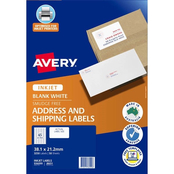 AVERY 936099 J8651 ADDRESS LABELS INKJET 65UP WHITE PACK 50