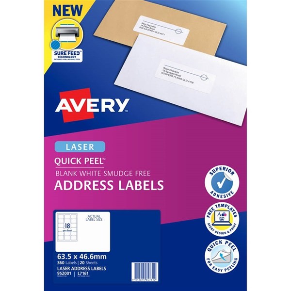 AVERY 952001 L7161 QUICK PEEL ADDRESS LABEL WITH SURE FEED LASER 18UP WHITE PACK 20