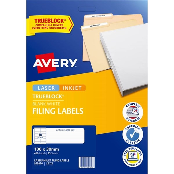 AVERY 959036 L7172 TRUEBLOCK FILING LABELS LASER/INKJET 18UP WHITE PACK 25