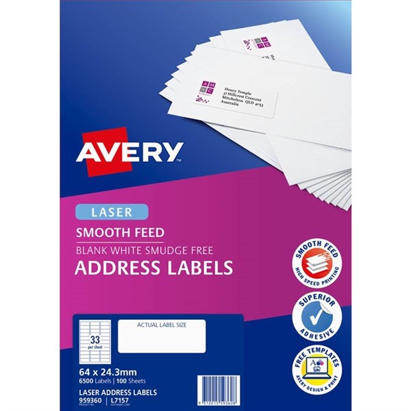 AVERY 959360 L7157 ADDRESS LABEL SMOOTH FEED LASER 33UP WHITE PACK 100