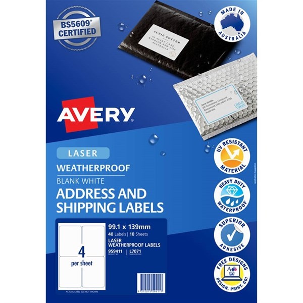AVERY 959411 L7071 WATERPROOF SHIPPING LABELS 4UP WHITE PACK 10