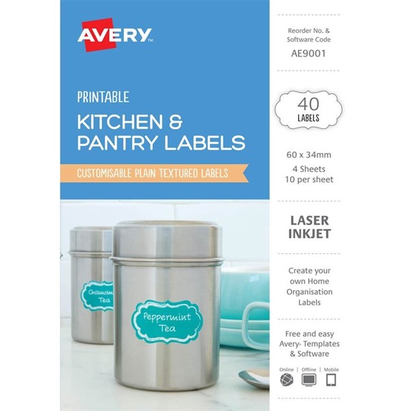 Create your own stylish and personalised organisation solutions with Avery textured white printable Kitchen and Pantry Labels - They are perfect for use on canisters, food storage containers, or any other storage item in the home