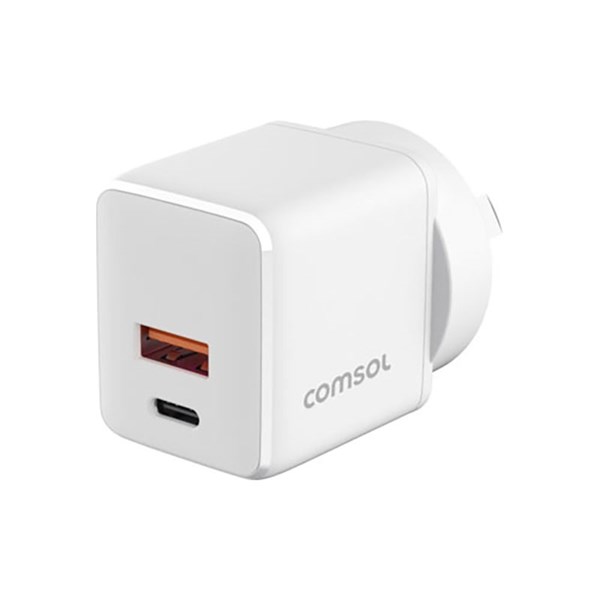 This is a Comsol 35W dual port USB GaN wall charger designed for fast and efficient charging - It features both USB-C and USB-A ports, allowing you to charge two devices at the same time