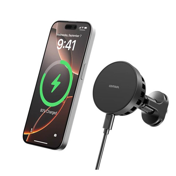 The Comsol Qi2 Cooling Wireless Car Charger Vent/Dash Black WCQ2CF is designed to provide fast, efficient, and cool wireless charging for Qi2-enabled smartphones while driving - It can be mounted on either the car air vent or dashboard for flexible placement and optimal viewing angles
