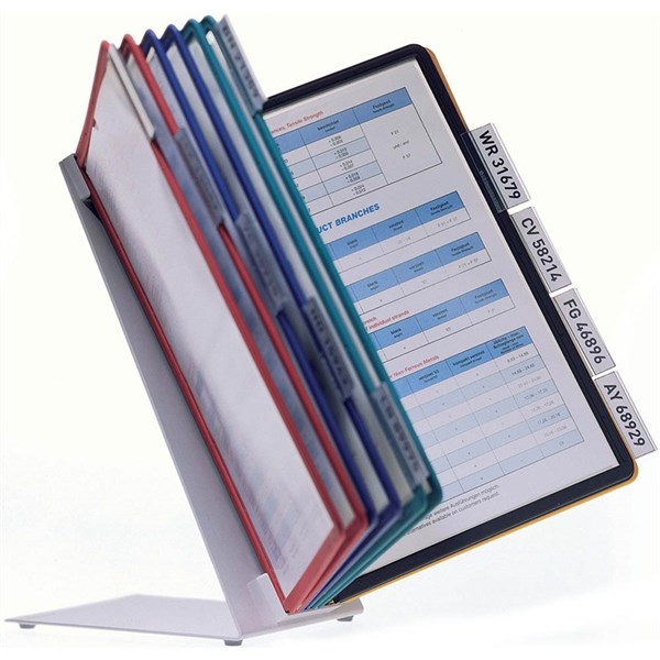 Durable Vario display system - Complete set for use on tables, made of powder-coated sheet steel, with SHERPA display panels in A4 format - With index tabs and blank insert labels for organisation
