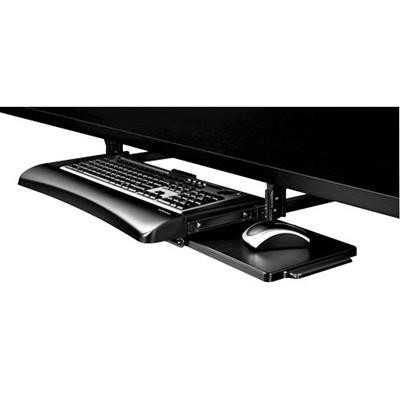 - Mouse tray mounts on either side of keyboard tray or stows underneath