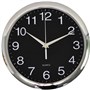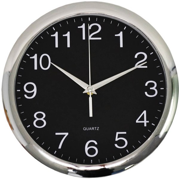 Tell the time with this modern 30cm wall mountable clock with black face and chrome trim - Suitable for corporate environment and home office