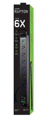 This Jackson Raptor Powerboard is designed to meet the high demands of modern electronic entertainment devices, including game consoles, TVs, sound systems and computers. It has 6 surge-protected outlets, individually switched with LED backlights for more control over your devices. You can also charge small devices with rapid-charging USB-A and USB-C ports- 240 volt output