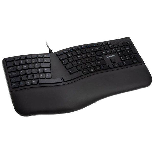 With its split and sloped keyboard with adjustable reverse tilt, and a built-in cushioned wrist rest, the ergonomist-approved Pro Fit Ergo Wired Keyboard positions your hands for improved comfort - Features include quiet typing; spill-proof keys; F-keys for shortcuts; caps lock, numbers lock, and scroll lock; and a plug & play USB connection