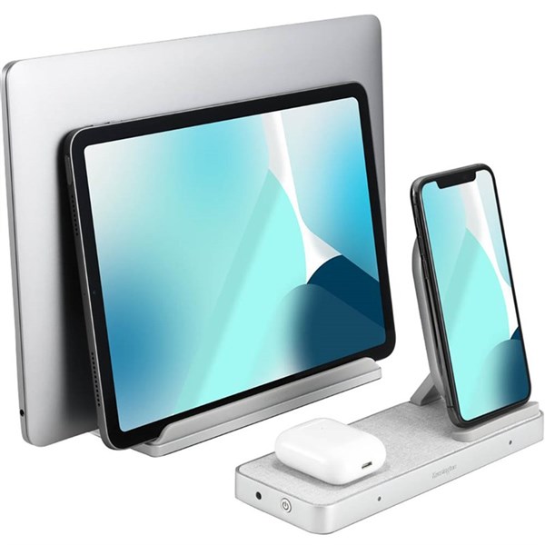 - Vertical stand cradles MacBook or iPad, Qi wireless charging for iPhone and AirPods and additional USB-A and USB-C ports for iPad, iPad Pro and Apple Watch (charging cables not included)