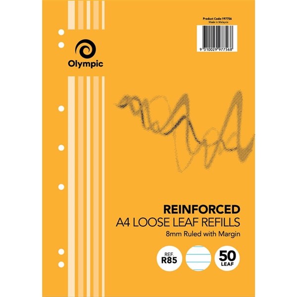 OLYMPIC R85 REINFORCED A4 LOOSE LEAF REFILL 7 HOLES 8MM RULED 50 PAGE 55GSM WHITE