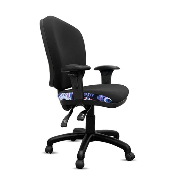 - A unique commercial fabrics designed by Nelly Patterson (Indigenous Artist) combined with K2 black fabric to upholster the chair