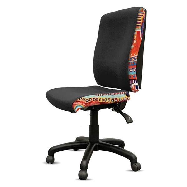 - A unique commercial fabrics designed by Nelly Patterson (Indigenous Artist) combined with K2 black fabric to upholster the chair