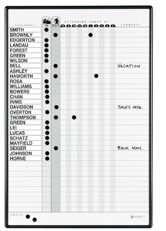 Track in/out status, time of return or jot notes for up to 36 employees- Includes a Quartet water-soluble marker, black magnetic in/out circles, magnetic name strips, self-stick vinyl letters and wet-erase magnetic remark strips