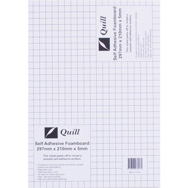 QUILL Self Adhesive Foam board has a peel-off covering sheet to reveal a smooth self adhesive surface with a rigid 5mm foam core - Quick and easy to use, no need for messy spray glue with high-tack quick bonding surface