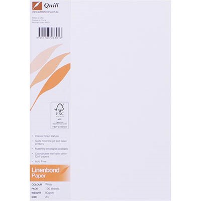 QUILL LINEN BOND PAPER A4 90GSM WHITE PACK 100