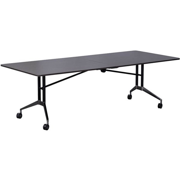 The Rapid Edge table is a full size boardroom table which folds for easy storage when not in use, saving valuable floor space - Elegant design with a slimline top with black rubber edging and a black and polished aluminium frame