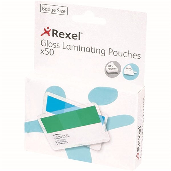 REXEL GLOSS LAMINATING POUCH 180 MICRON BADGE SIZE 67 X 98MM CLEAR PACK 50