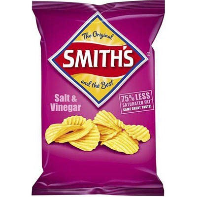 Smith's Crinkle Cut Salt and Vinegar Potato Chips - There is no better snack when watching the footy grand final, having a picnic or indulging after work - Our top quality Aussie potatoes are peeled and sliced to just the right crinkle cut thickness and cooked to perfection then sprinkled with our famous seasoning so you can enjoy the classic crunch and unbeatable flavour that only a Smith's potato chip can bring!