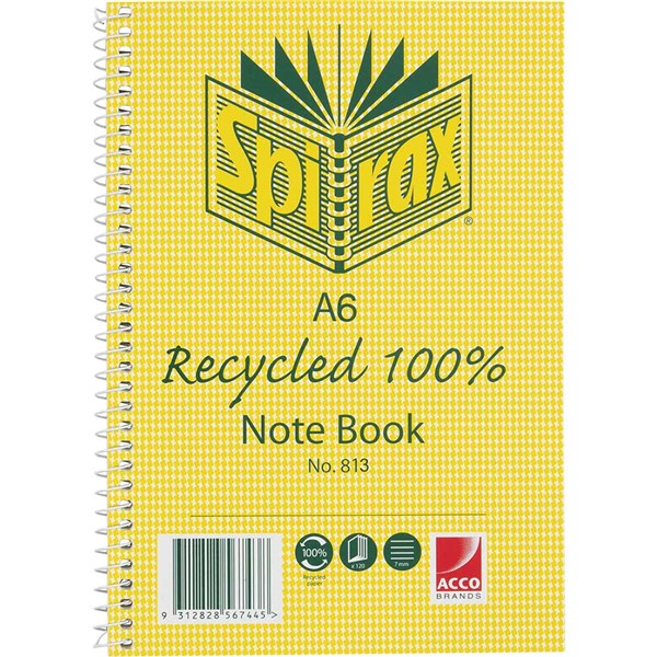 SPIRAX 813 NOTEBOOK 7MM RULED 100% RECYCLED CARDBOARD COVER SPIRAL BOUND A6 100 PAGE