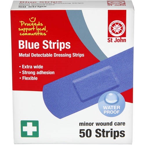 - St John Blue Sterile Adhesive Strips 50 pack are strong, highly visible, metal detectable and can be used in manufacturing industries that are required to scan for foreign objects