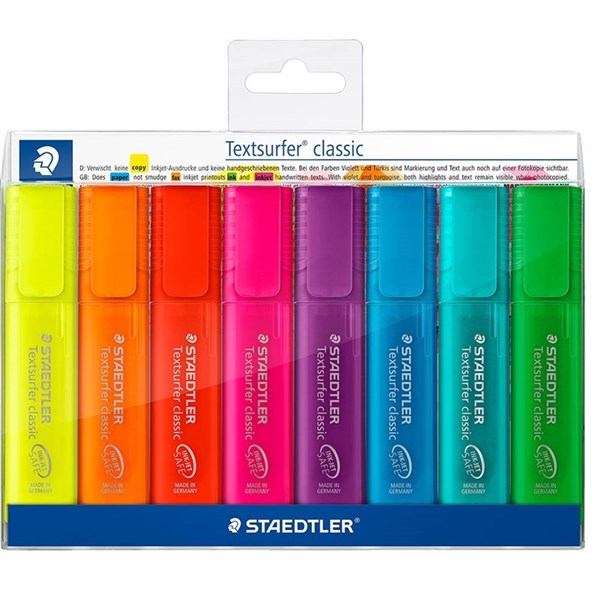 Staedtler textsurfer classic performs perfectly on inkjet print-outs without smudging the ink and with the highlights still remaining visible after photocopying - Highlighter with large ink reservoir for extra-long highlighting performance