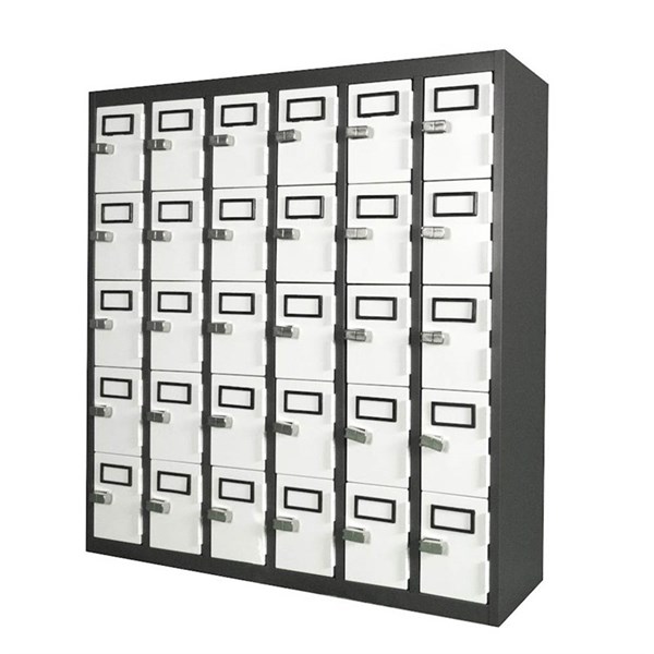 STEELCO PHONE LOCKER 30 DOOR 900 X 225 X 940MM GRAPHITE RIPPLIE CARCASS AND WHITE SATIN DOORS