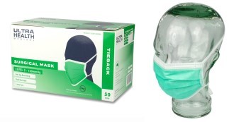 SURGICAL MASK GREEN EAR TIES 3PLY LEVEL 3 LATEX FREE FLUID RESISTANT ANTI FOG PK50