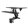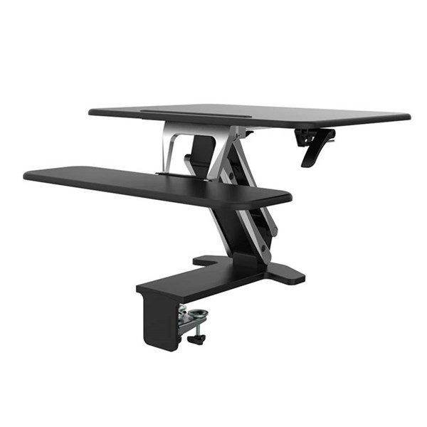 • The clamp on unit simply attaches to the front edge of any surface and provides a one handle easy adjustable sit stand work surface