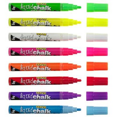 Texta wet wipe liquid chalk markers are water soluble so they simply wipe clean of any non-porous surface using a damp cloth - Designed for use on glossy surfaces and porous surfaces including blackboards