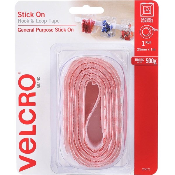 VELCRO BRAND STICK-ON HOOK AND LOOP TAPE 25MM X 1M WHITE