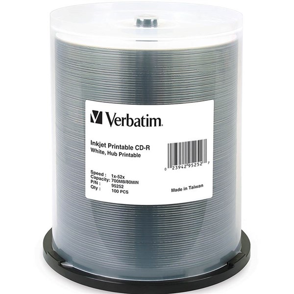 Verbatim 52X White Inkjet, Hub Printable CD-R discs are the ideal choice for full-colour edge-to-edge photo and text printing on CD/DVD inkjet printers - These inkjet printable discs consist of a unique white surface coating for exceptional colour reproduction of high-resolution photos, graphics or other images