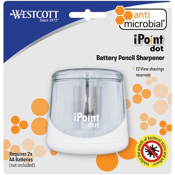 Westcott iPoint Dot battery operated sharpener features stainless steel blades and an EZ view shavings reservoir - Product base is infused with Antimicrobial protection to inhibit the growth of bacterial odours