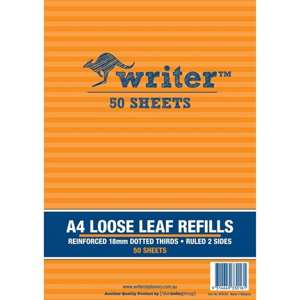 WRITER LOOSE LEAF REFILL REINFORCED 18MM DOTTED THIRDS 60GSM A4 50 SHEET